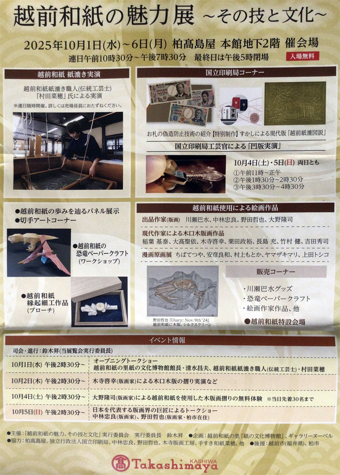 このたびお誘いをいただき、こんな面白い企画に参加できることになりました。 越前手漉き雁皮紙を使用して、木口版画を刷らせて頂きました。 普段使用している和紙より、かなりしっかりしていて、何処まで細部が表現できるか気になっていましたが、 初めて、大変摺りやすくて、ワクワク感がありました。 私は5点出品。先輩方に混じって、どんなに見えるのか、、楽しみです。 偶然同時期に埼玉熊谷、八木橋の個展と重なり、こちらには伺えません。それが残念です。 お近くの方は是非、ご覧になって頂きたいと存じます。 竹村健